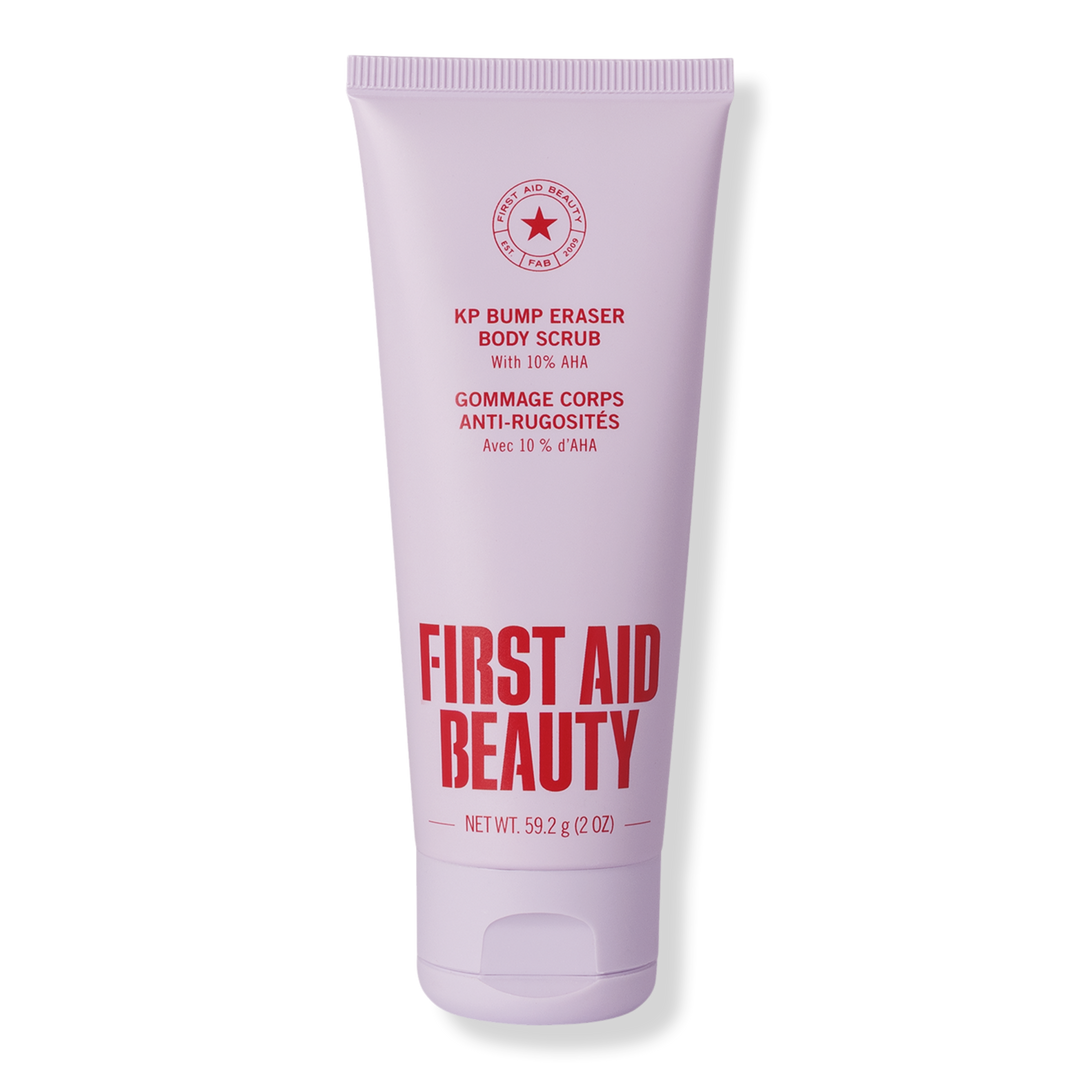 First Aid Beauty's KP Bump Eraser Body Scrub with 10% AHA sweeps away dry, rough bumps associated with KP & strawberry skin, to reveal healthier skin.