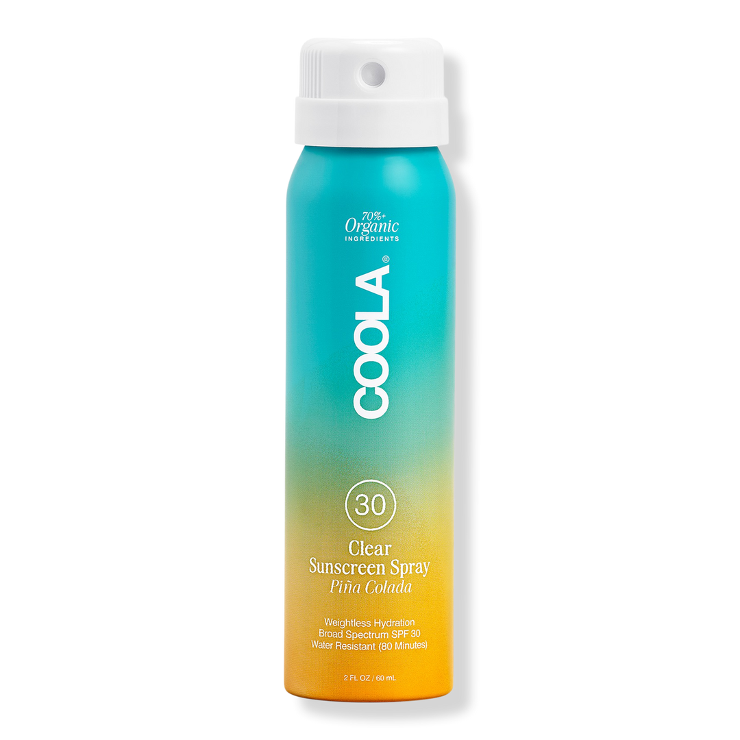 COOLA's Travel Size Piña Colada Classic Body Organic Sunscreen Spray SPF 30 is a lightweight, non-aerosol spray for water-resistant sun protection.