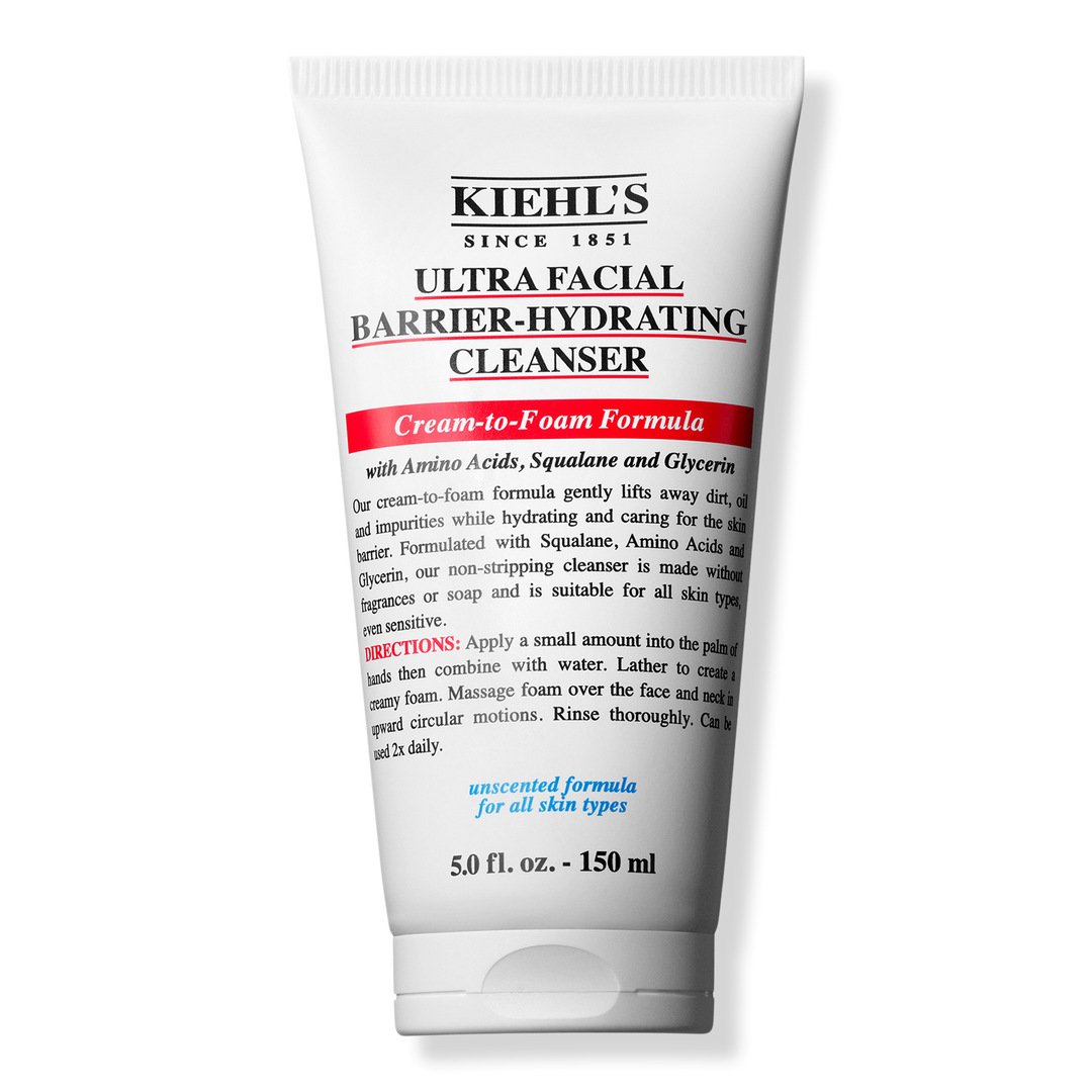 Kiehl's Ultra Facial Barrier Hydrating Cleanser is a cream-to-foam facial cleanser that removes makeup and sunscreen without stripping skin.