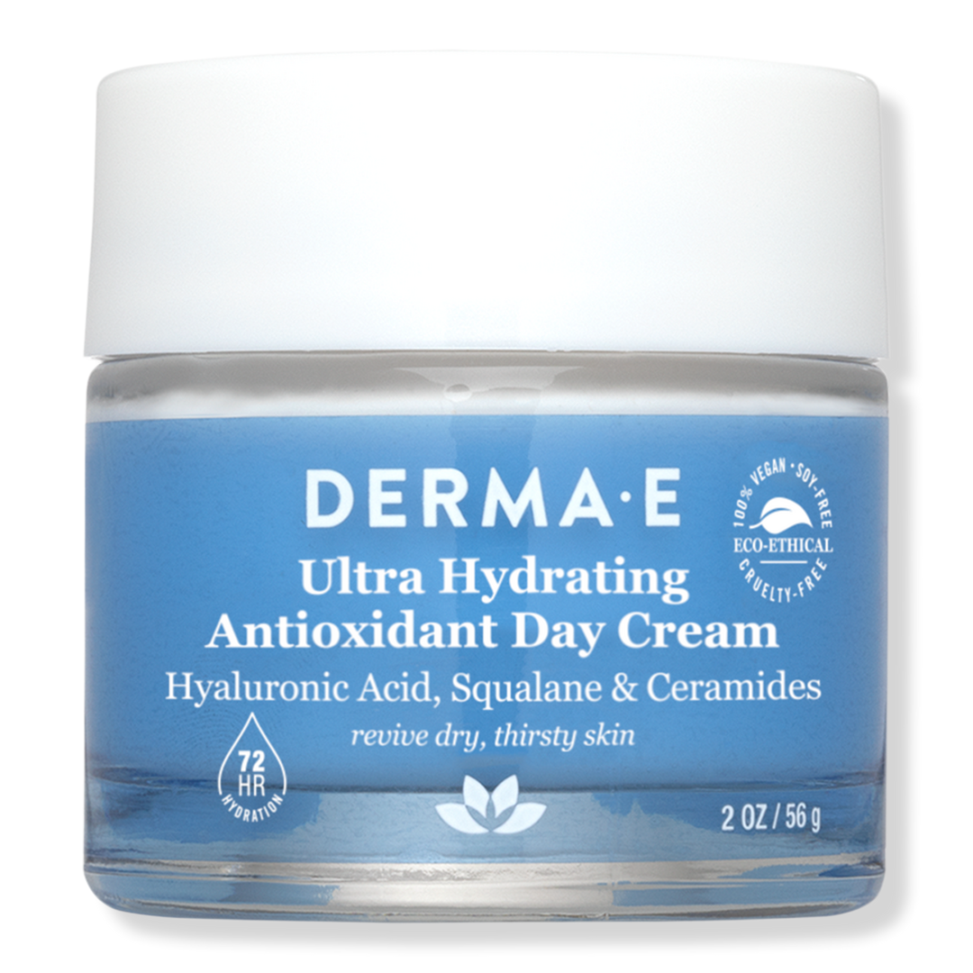 Derma E's Ultra Hydrating Antioxidant Day Cream with Hyaluronic Acid thoroughly moisturizes and plumps to reduce the look of fine lines and wrinkles.
