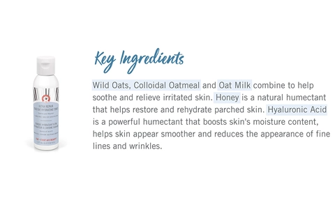 - Oat milk, Colloidal Oatmeal and Wild Oats are combined with Honey and Hyaluronic Acid to help soothe, relieve redness and hydrate.