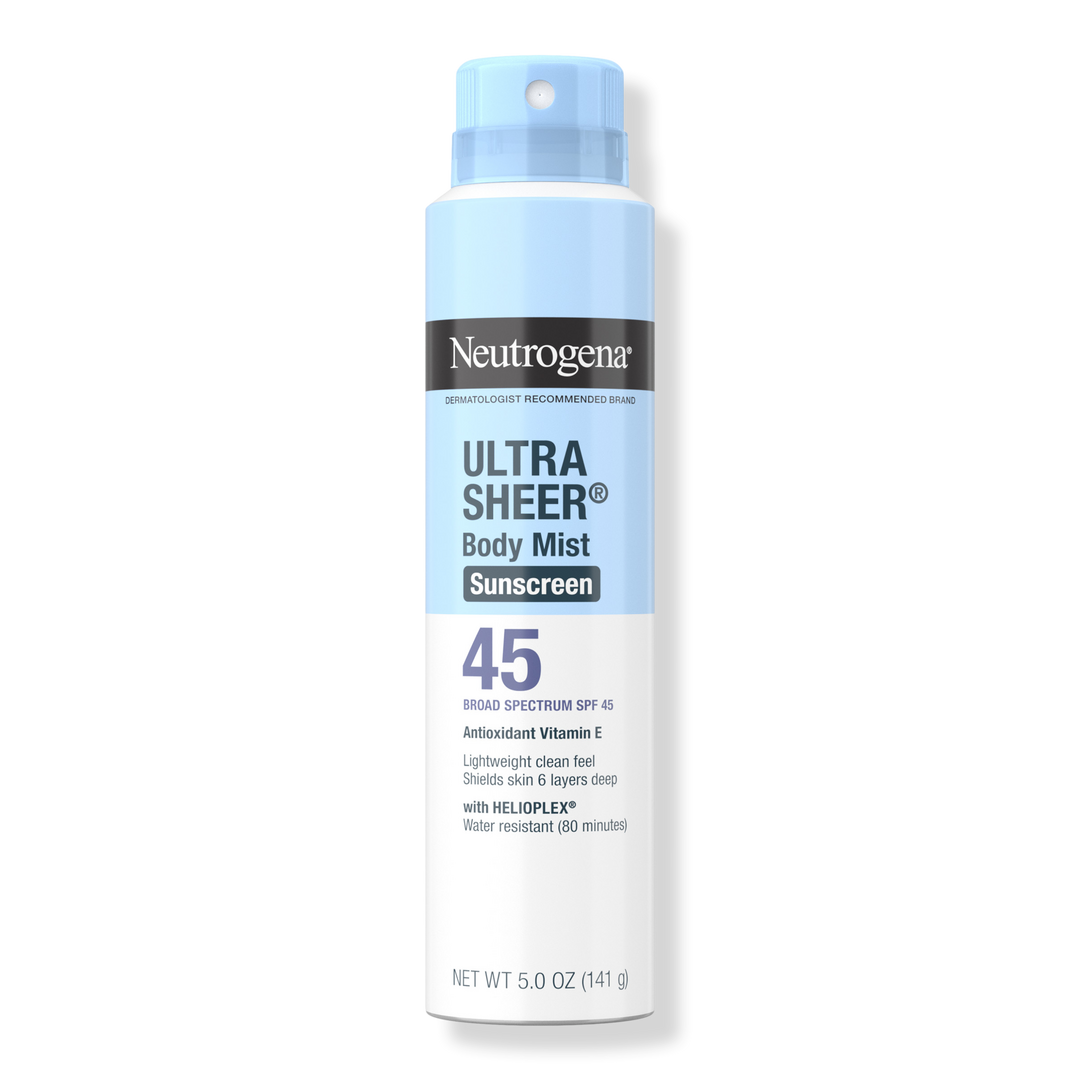 - 5.0 oz can of Neutrogena Ultra Sheer Body Mist Broad Spectrum SPF 45 sunscreen spray that is lightweight, non-greasy and water resistant for superior UVA/UVB sun protection with a weightless, clean feel