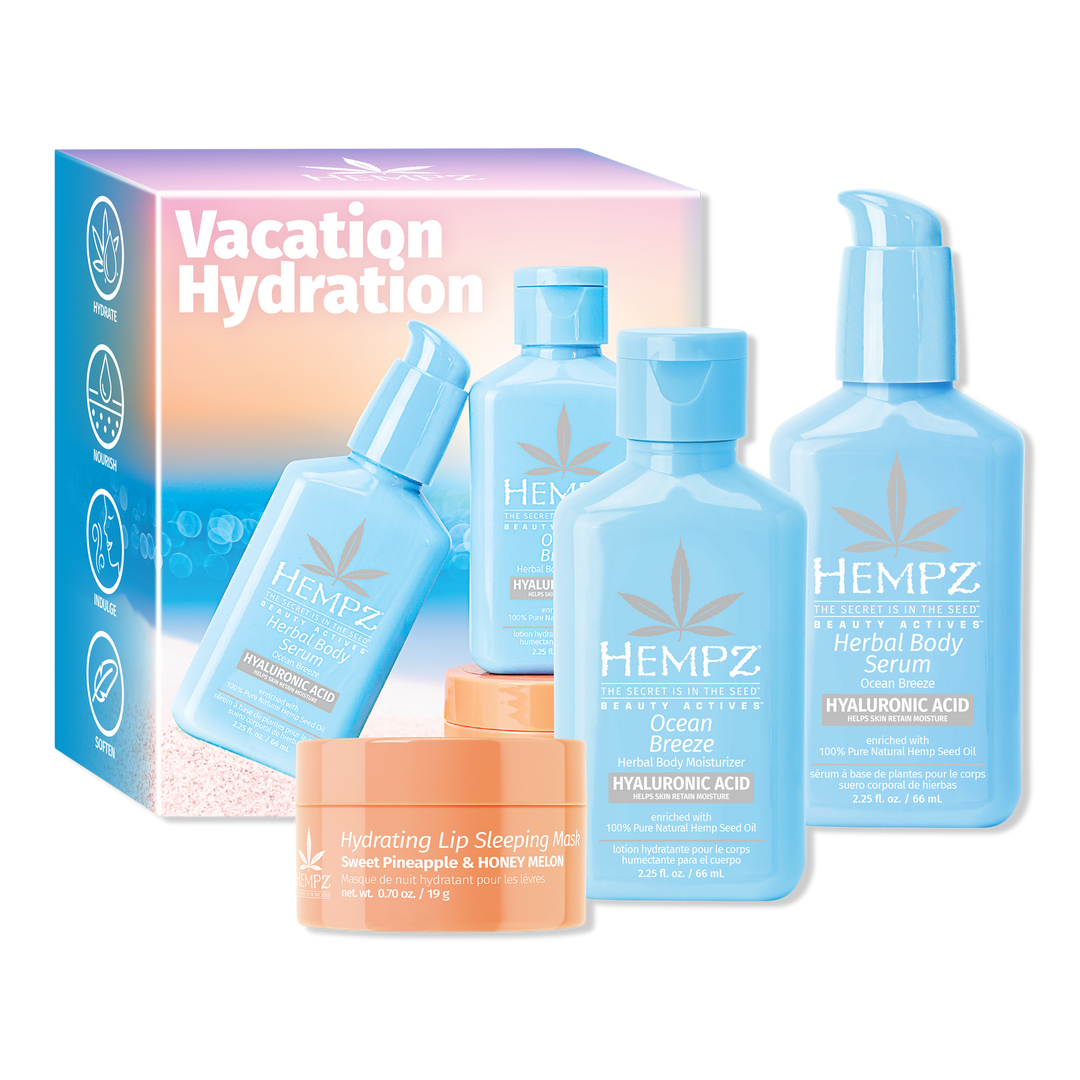 Escape to paradise with the Hempz Vacation Hydration Kit! This travel-sized trio features tropical scents and skin-loving ingredients for instant hydration. Perfect for your purse, car, or carry-on, it's a must-have treat for yourself or a thoughtful gift.