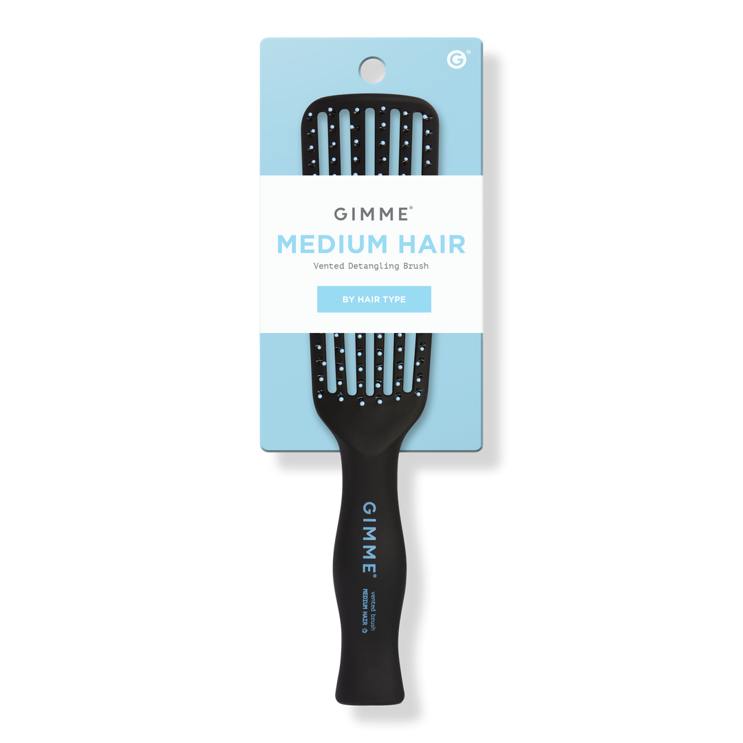 Gimme Beauty's Vented Detangling Brush. This brush's temperature-resistant bristles let you bring on the heat with a vented design allowing for maximum airflow, to speed up your dry time. This brush's curved shape & ball-tipped bristles are gentle on the scalp.