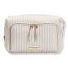 Form meets function with the Tartan + Twine Vertical Quilted Double-Zip Toiletry Bag! Gold-tone hardware and a vertical quilted light beige exterior with wipe-clean pockets.
