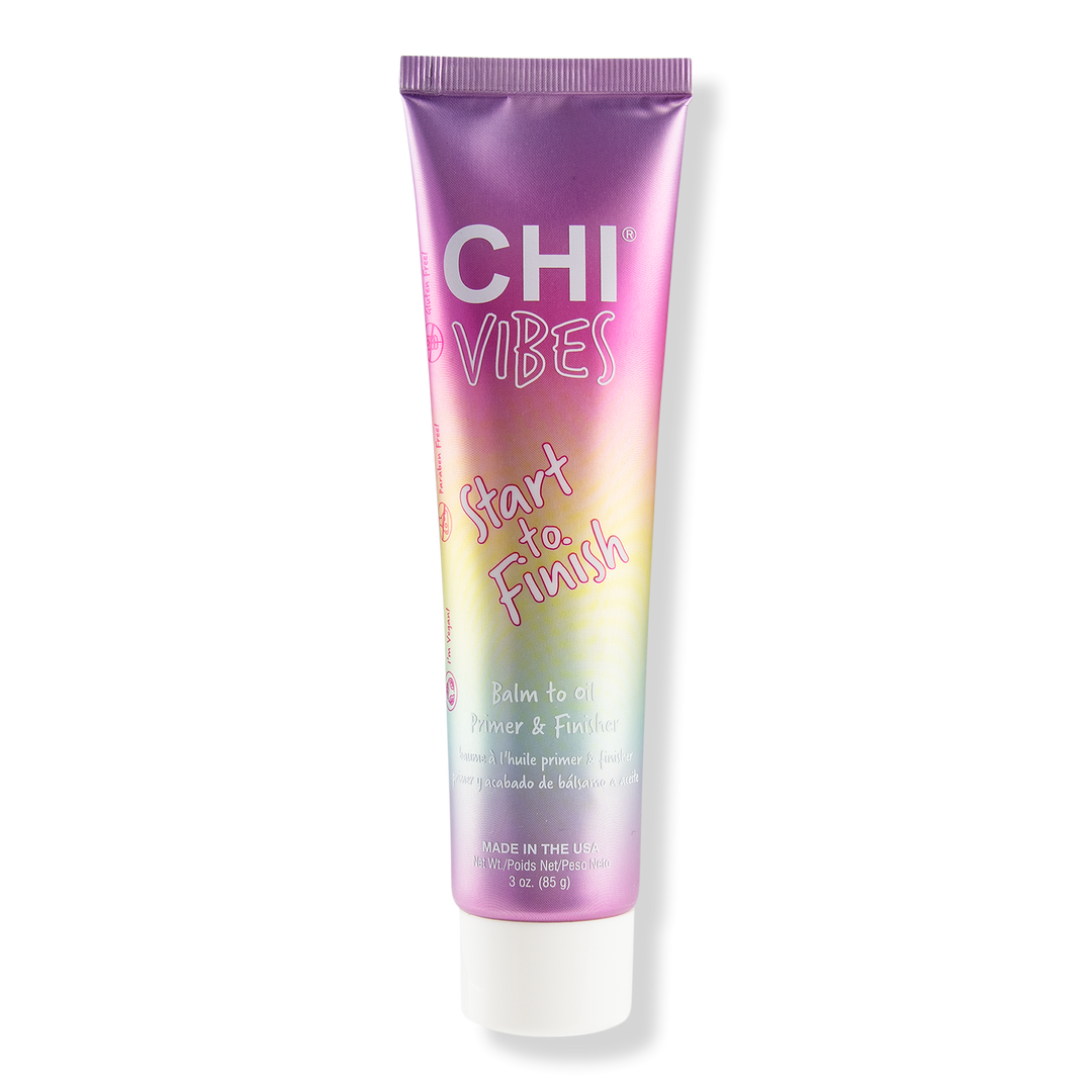 CHI Vibes Start To Finish Balm To Oil Primer & Finisher. Use this product from start to finish to prime hair for a blow dry treatment and to finish hair with smooth perfection. Offers heat protection to prevent heat damage and breakage.