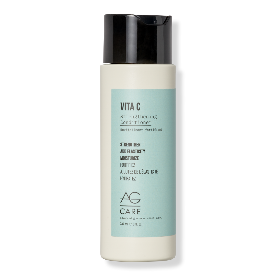 Add strength and shine using AG Care nourishing, vegan Strengthening Conditioner containing vitamin C and plant-based squalene to help increase collagen, add elasticity and fortify the cuticle.