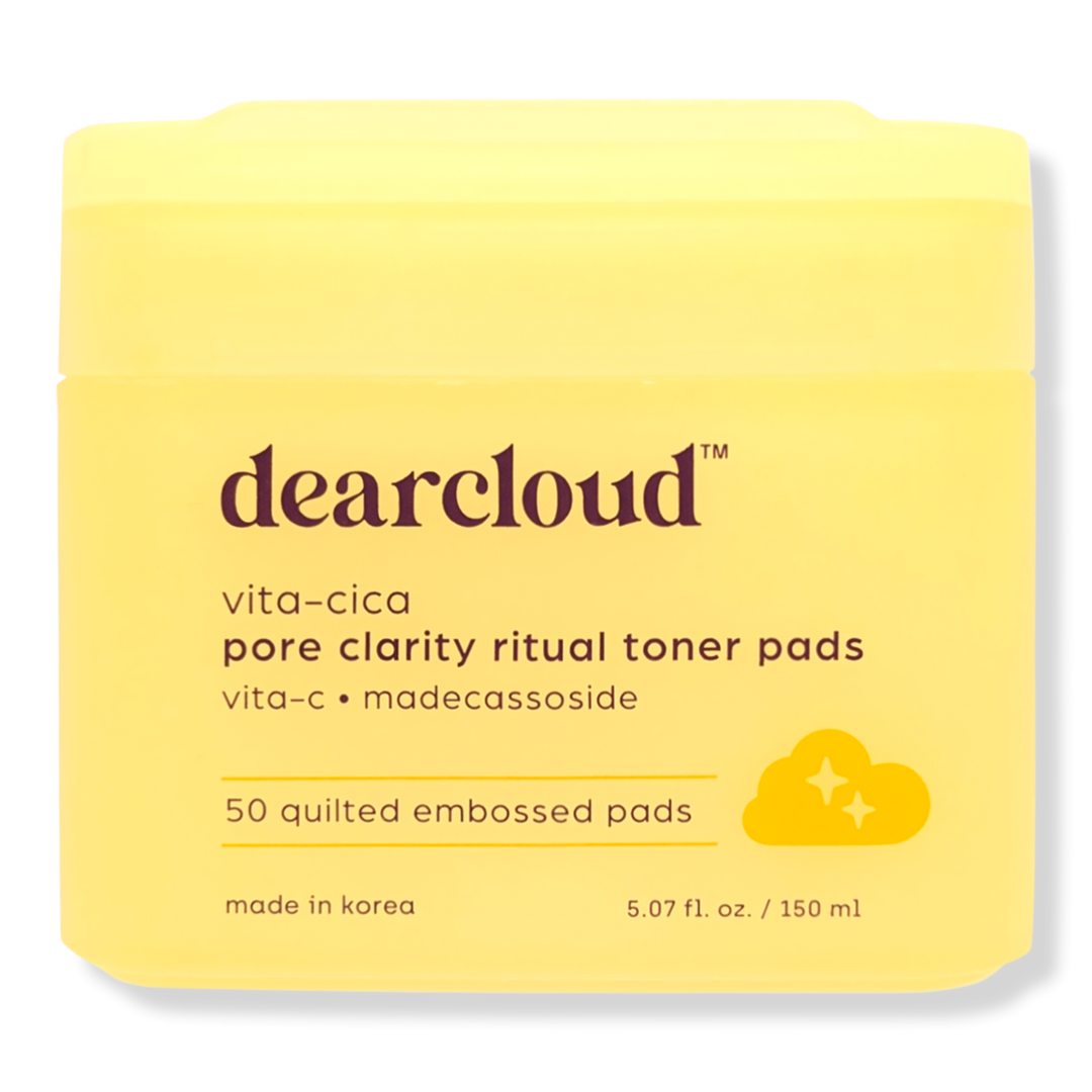 dearcloud's quilted & embossed Vita-Cica Pore Clarity Toner Pads for gentle exfoliation and radiant, clear skin. Your daily skin fix, and blemish-fighter. Infused with Vitamin C and Madecassoside for a brighter, toned appearance.