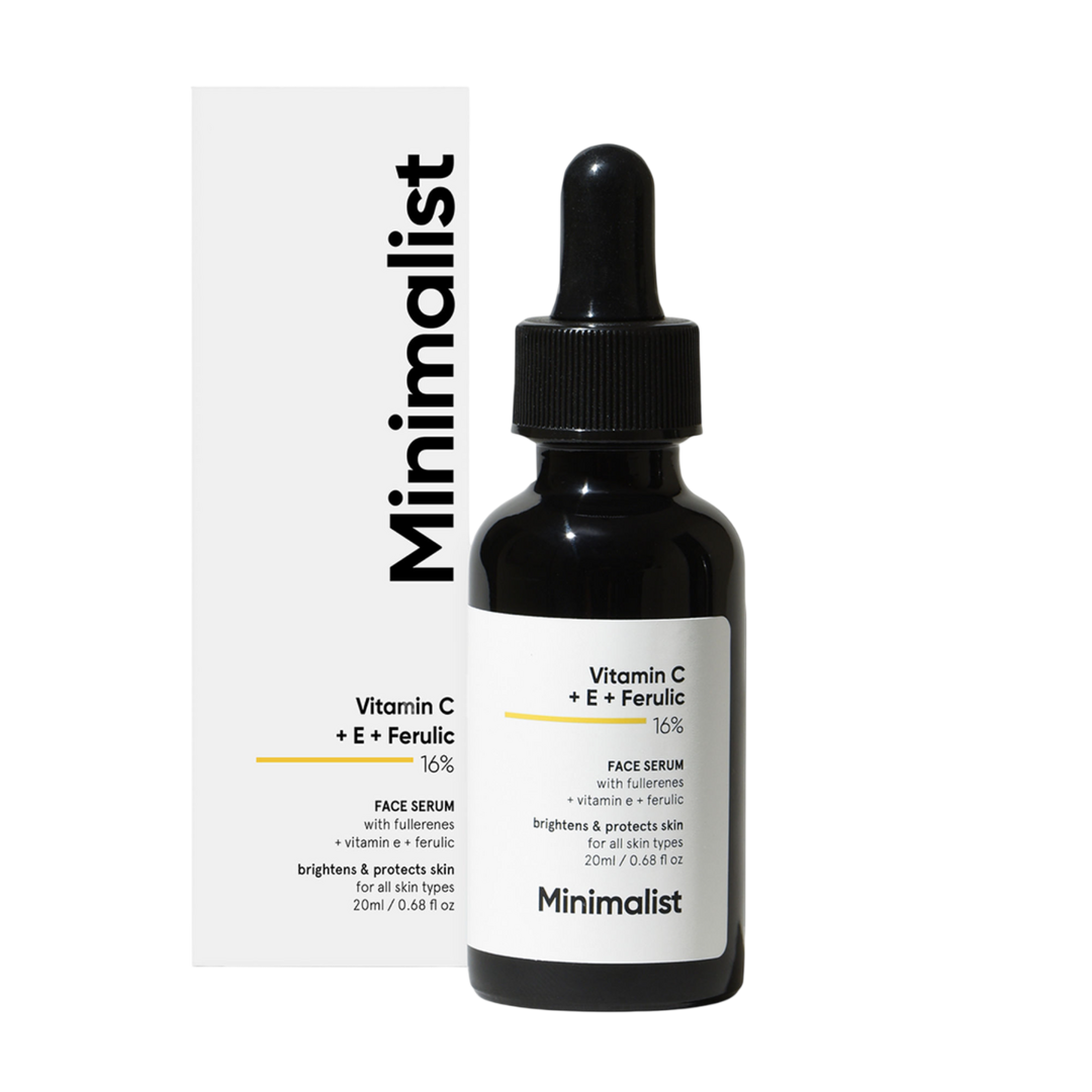 Minimalist Vitamin C+E+Ferulic Acid 16% Face Serum with Antioxidants for Anti-Aging & Glow reduces Skin Damage & Redness to Brighten Dull Complexion.