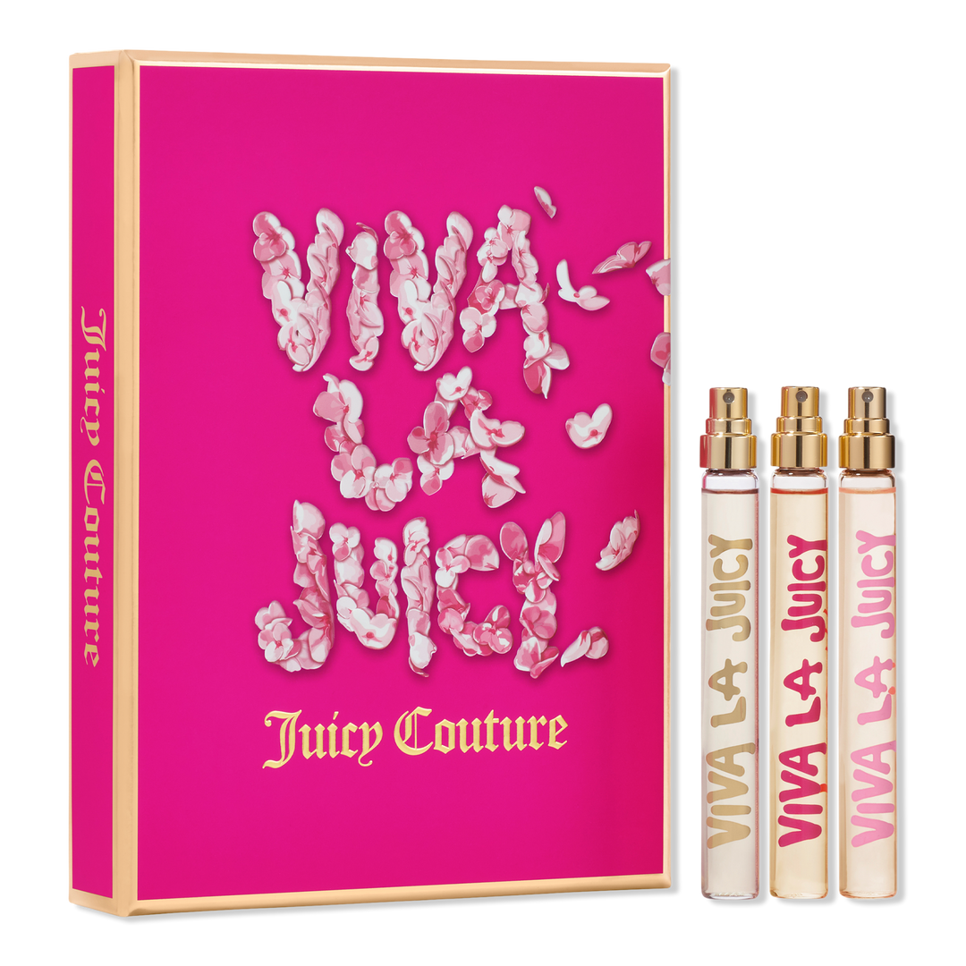A set of 3 perfect-for-travel Juicy Couture fragrances - Viva La Juicy with delicious Berries, Vanilla & Jasmine. Viva La Juicy Gold Couture with luscious Berries, Golden Amber & Caramel. Viva La Juicy Sucré with Mandarin, Peach & Vanilla.