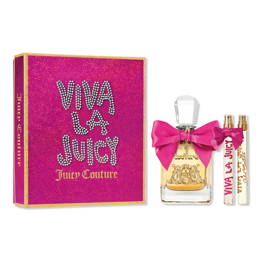 This Juicy Couture set includes: Viva la Juicy 3.4oz Eau de Parfum Spray, Viva la Juicy .33oz Eau de Parfum Spray Pen, and Viva la Juicy Gold Couture 0.33oz Eau de Parfum Spray Pen.
