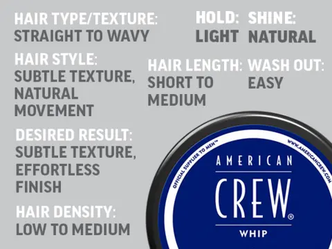 WHIP Styling Cream by American Crew is an airy, weightless formulation that provides subtle texture and control for a natural, effortless look, without stickiness.