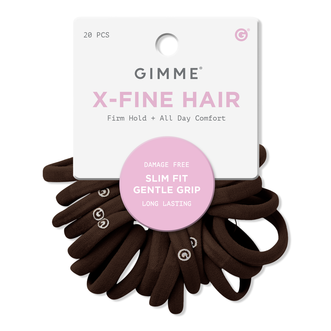Discover Gimme Beauty hair bands, perfect for extra fine hair! Strong yet gentle grip, no snagging, breaking, dents, or creases. Effortless styling awaits!
