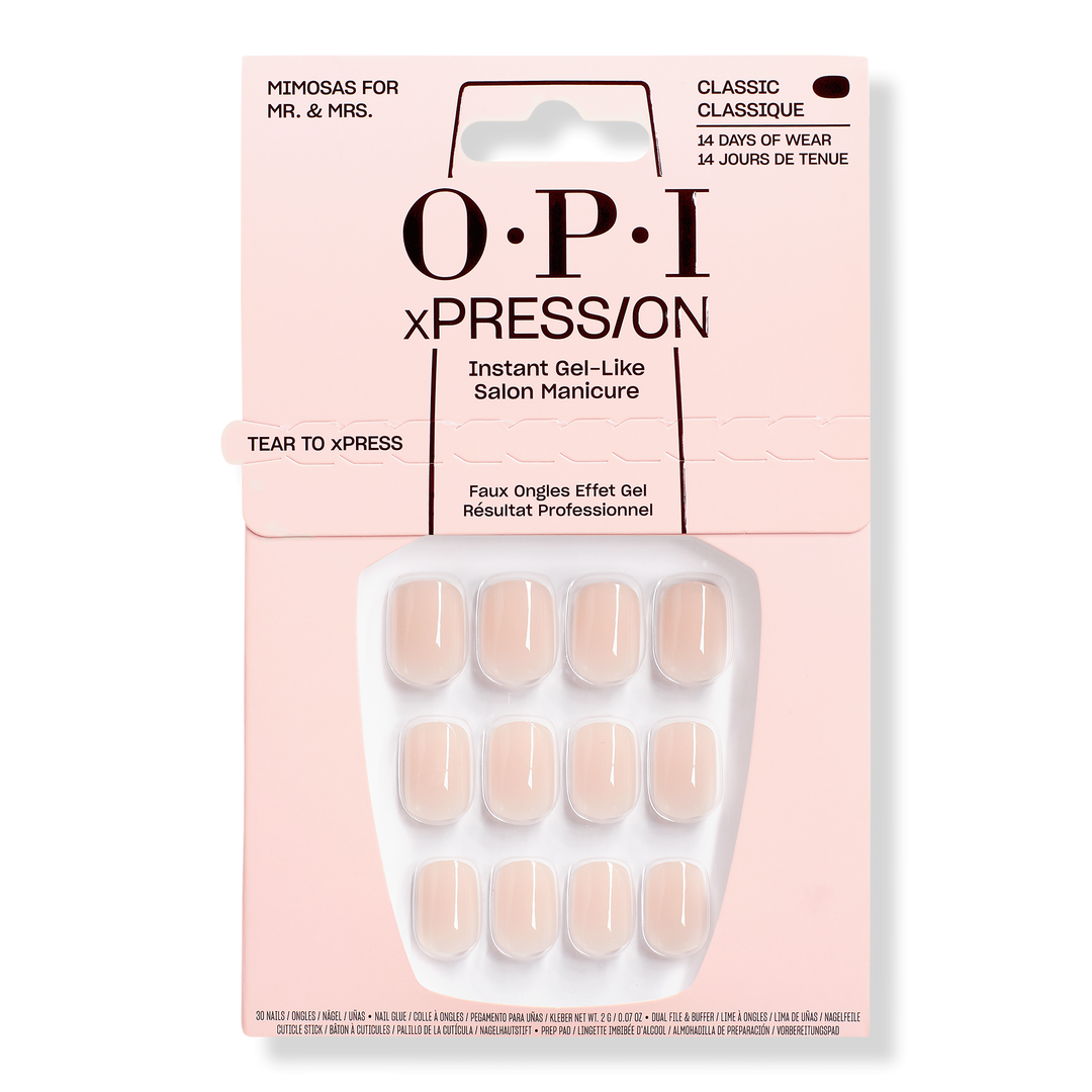 - Shade matched to OPIconic Mimosas for Mr. & Mrs., this neutral, hint-of-pink press-on nail set is a perfect marriage between subtle and stunning. How can you not fall in love?