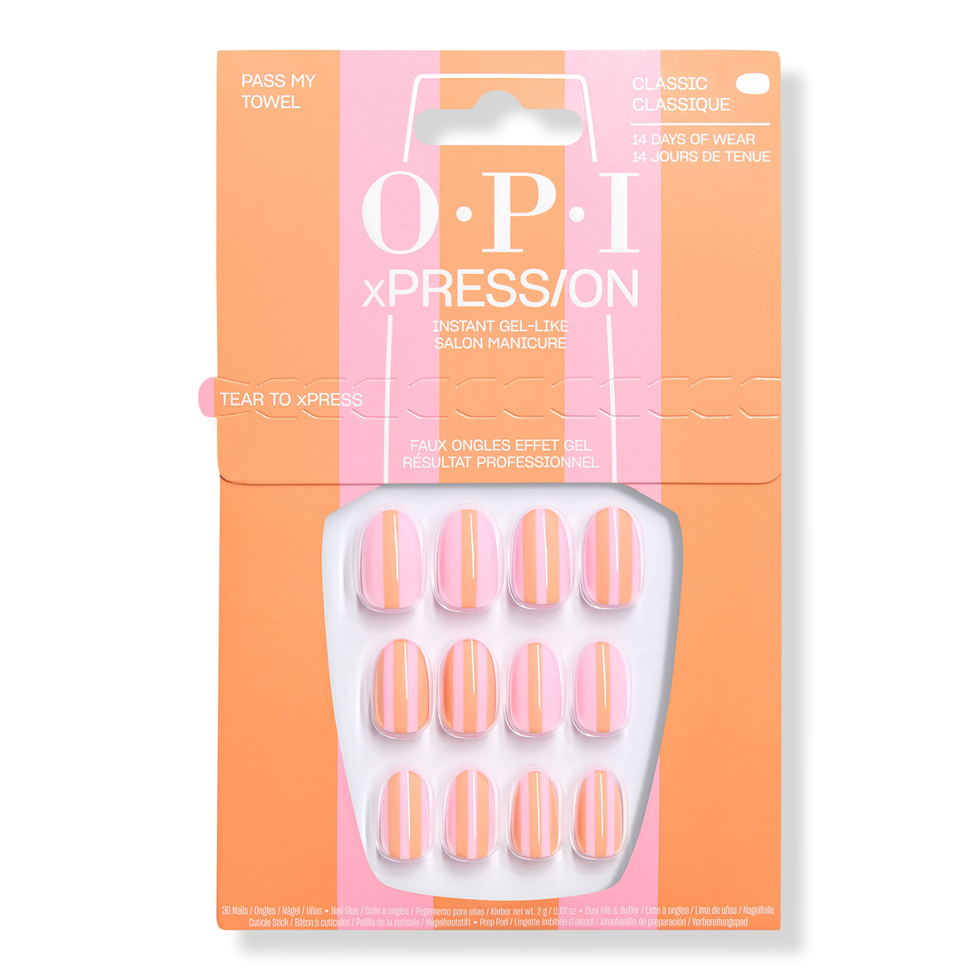 - Wrap up summer with OPI Pass My Towel press-on nails. Pink-and-orange striped tips in a classic round shape that brings pool-to-beach style and easy vacay-ready wear with sunny nail energy.