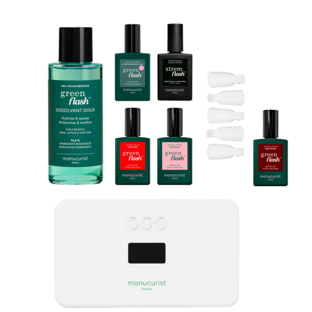 *Step 1 – Apply one coat of Green Flash™ Vitaminized Base Coat, then two thin coats of Green Flash™ gel nail polish, curing after each layer. No primer needed. *Step 2 – Apply a thin coat of Xtrem Flash™ gel top coat to four fingers (excluding the thumb) and cure under the LED Lamp using the Top Coat program. *Step 3 – Repeat on thumbs separately, keeping them flat, then cure. The top coat is instantly dry and resistant—no wiping required.