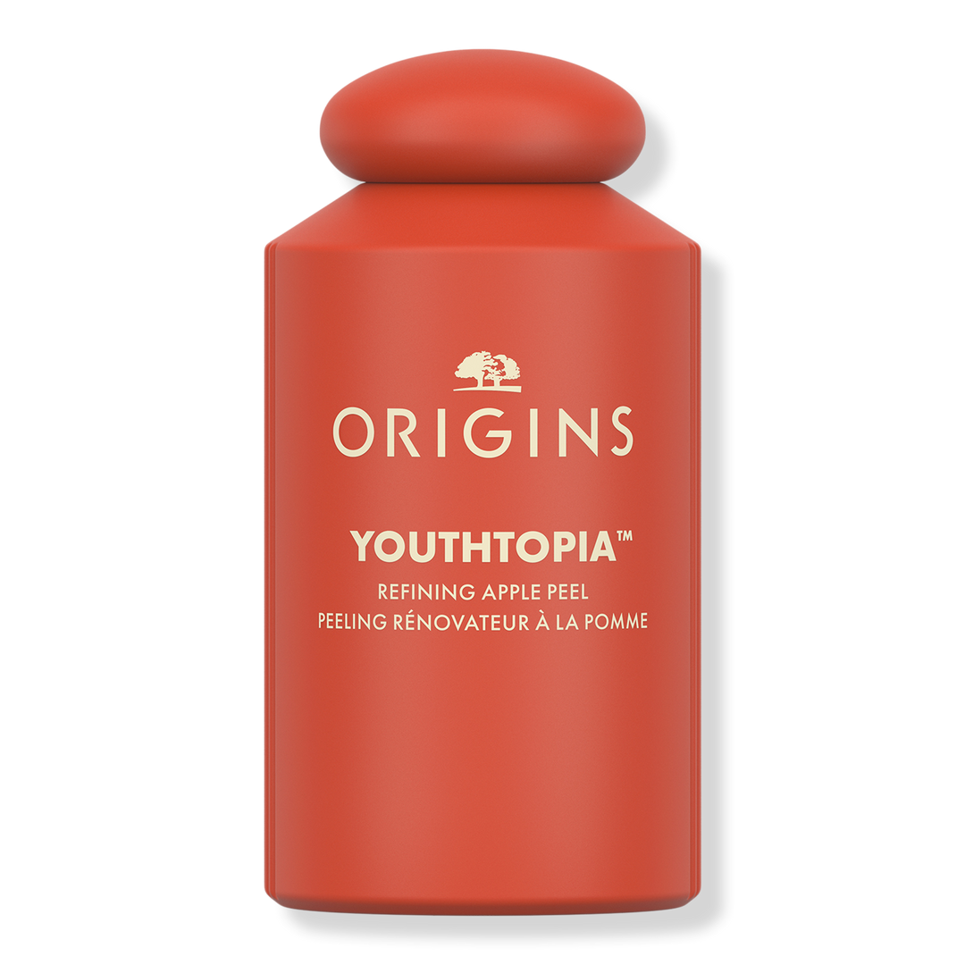 Origins' Youthtopia Liquid Exfoliating Apple Face Peel uses apple cider vinegar and glycolic acid complex to smooth skin and reduce the look of pores and boost radiance.
