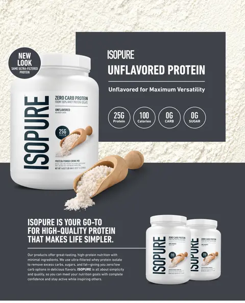 ISOPURE Protein Powder delivers 25g of high-quality, smooth and delicious protein in every serving for an effortless way to get the nutrition you want each day. Made with ultra-filtered 100% whey protein isolate, each scoop also serves up 20 vitamins and 0g sugar.